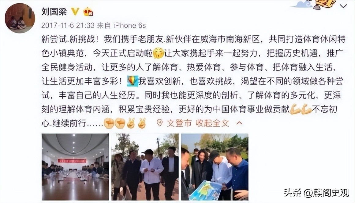 2017年时,刘国梁现身威海市,参与雅乐居地产的签约仪式,双方将共同打造一座休闲特色小镇,而这座小镇的总投资高达500亿元。