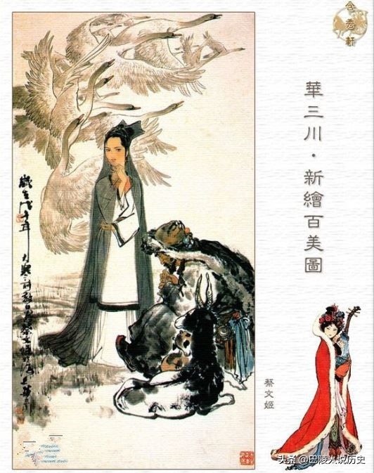 蔡琰,字明姬,后因避司马昭的名讳,改为文姬。蔡邕的女儿,性情温柔,才智过人,琴棋书画,无一不精,号称三国第一才女。初嫁卫氏,夫亡无子,归宁于家。南匈奴入侵时,为匈奴左贤王所掳,身陷南匈奴十二年,生二子。后曹操遣使将她赎还,重嫁同郡董祀。回汉后参考胡人声调,结合自已的悲惨经历,创作了哀怨惆怅,令人断肠的琴曲《胡笳十八拍》;嫁董祀后,感伤乱离,作《悲愤诗》,是中国诗史上第一首自传体的五言长篇叙事诗(当然也有人认为是伪作)。据说蔡文姬凭记忆将家中藏书400篇默写赠予曹操,可谓才貌双全。