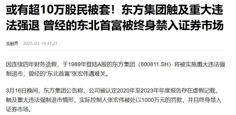 参考信源:金融界——《或有超10万股民被套!东方集团触及重大违法强退 曾经的东北首富被终身禁入证券市场》