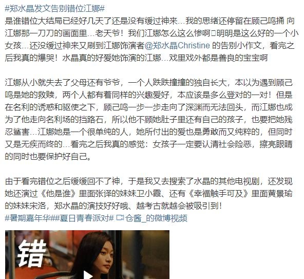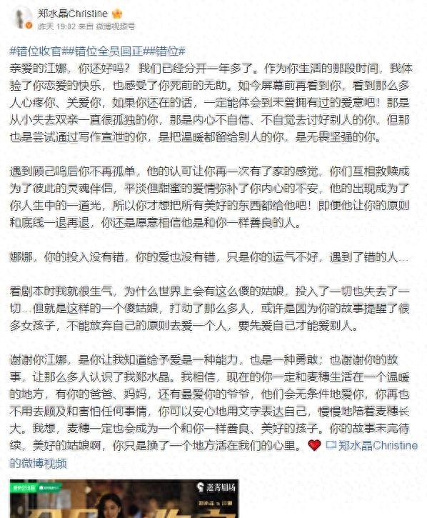郑水晶的告别长文细节感人,她在文中表达了对江娜深深的爱和感谢。她感谢江娜这个角色带给她的成长和改变,也感谢观众们的支持和喜爱。网友们纷纷在评论区表达了对郑水晶的支持和喜爱,希望她在未来的演艺道路上能够继续发光发热。