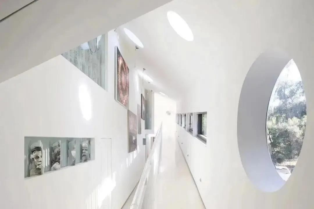 室内设计灵感源于古根海姆博物馆,走廊一侧挂满油画,另一侧则是方形小窗户,爬坡时欣赏画作更像是逛博物馆了。