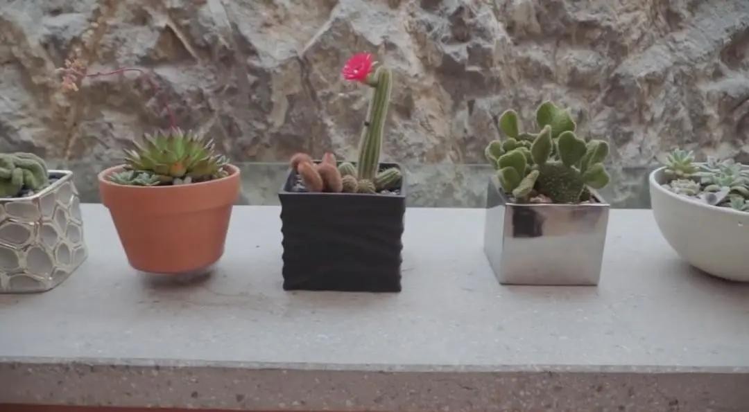 山体墙壁前方的长台摆满粉色兵马俑和仙人掌盆栽,另外一侧放着欧洲艺术雕塑和唐代雕塑,两种风格并不会突兀,反而让客厅变得活泼。