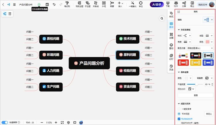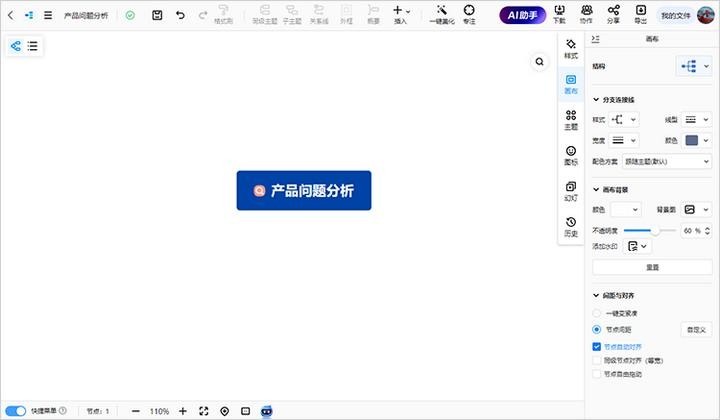 3、画布:在“画布”模块,可自定义调整思维导图的结构、分支连接线、画布背景、间距与对齐的样式等。