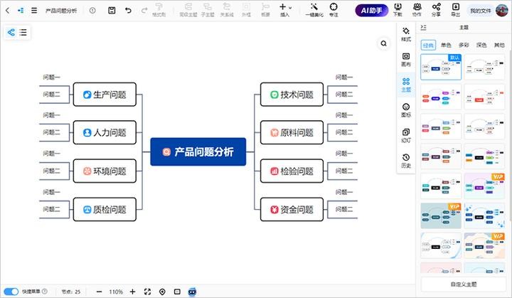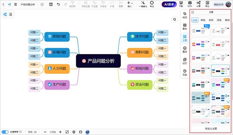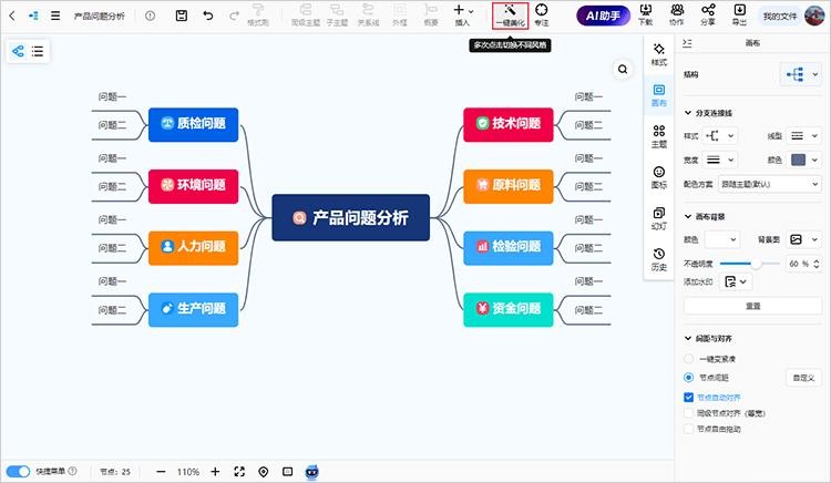1、一键美化:功能下预置超多不同风格的样式,点击【一键美化】功能,就能切换导图风格,丰富风格一键应用。