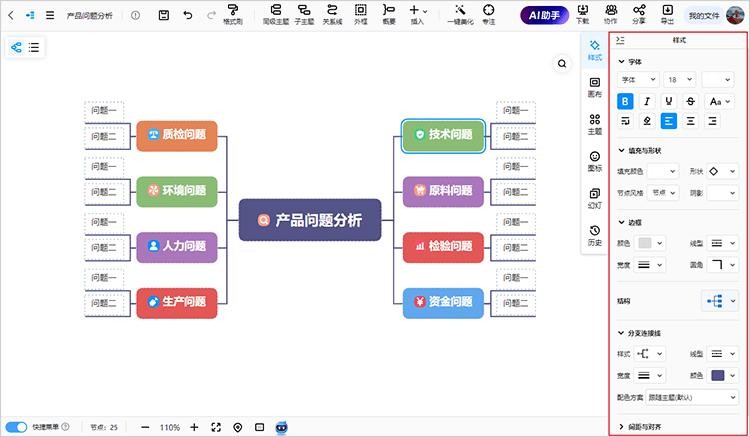 4、样式:在“样式”模块,可自定义设定思维导图的字体、填充与形状、边框等样式。