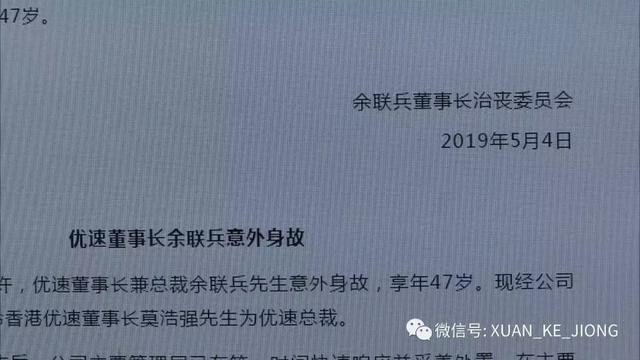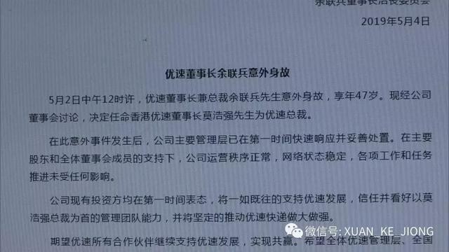 而在事发后,优速方面成立余联兵董事长治丧委员会,并发布讣告称:董事长兼总裁余联兵先生因发生意外,于北京时间(当地时间)2019年5月2日12时许,不幸离世,享年47岁。并介绍:现经公司董事会讨论,决定任命香港优速董事长莫浩强先生为优速总裁。