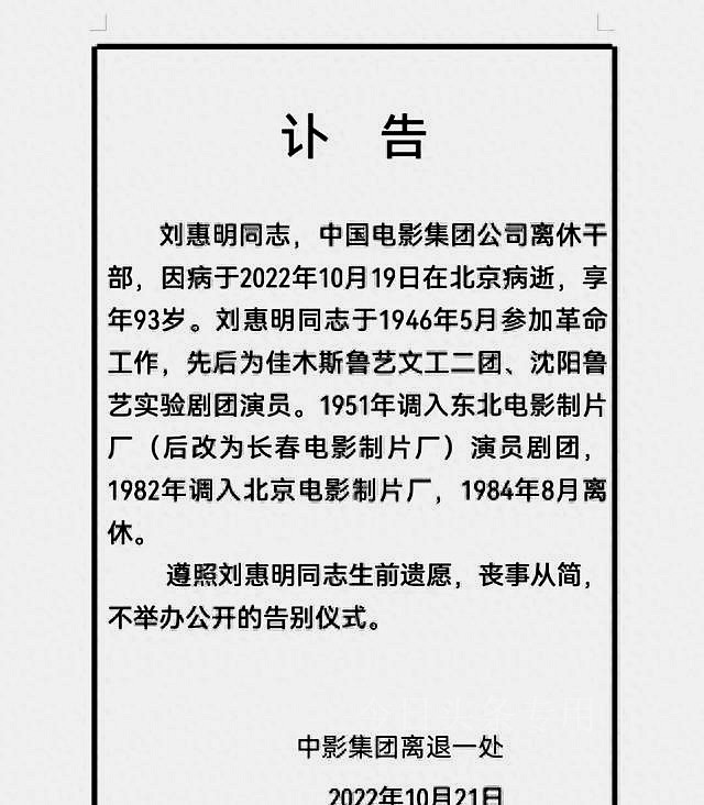 刘惠明,这个名字也许并不为众多人熟知,但她却是一位演艺圈内不可忽视的重要演员,她的演艺生涯充满了坚韧和才华。2023年10月19日,刘惠明因病在北京去世,享年93岁。