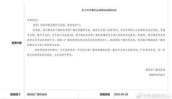 6月28 日晚,有网友发现高天鹤在《天天向上》中的镜头遭遇“一剪没”,不仅宣传海报没了他的踪影,片头五人亮相也剪辑成了四人。有不少网友猜测高天鹤的相关画面被P掉,是被仝卓连累才有此一遭。还有粉丝爆出是高天鹤主动和《天天向上》解约,放弃了做主持的机会。其实早在几月前,就有网友举报高天鹤在2019年全国广播电视编辑记者、播音员主持人资格考试中作弊,面对质疑,高天鹤本人一直未作出回应。6月29日,湖南省广播电视局通报高天鹤在考试中存在违反考试纪律的行为,已取消其考试成绩。随后,高天鹤在微博发出致歉信,承认自己在此前主持人考试作弊一事,并表示为自己心存侥幸的心理和错误的行为感到羞愧,痛心于辜负了爱他的粉丝和观众朋友。