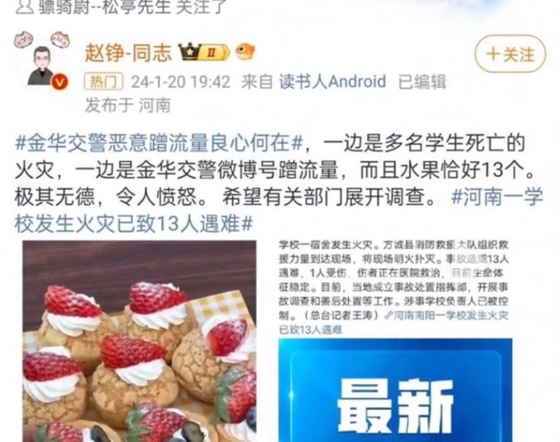 金华交警的微博在火灾发生的当天发布了一个让人震惊的内容,他们发出了“周末愉快,希望好心情,跟我照常起床,烦心事永久打药”的文字,配图是一些小吃,还带了一个关于火灾的话题。这个微博引发了众怒,人们纷纷质疑金华交警的底线在哪里,为何要在别人的痛苦上撒盐。