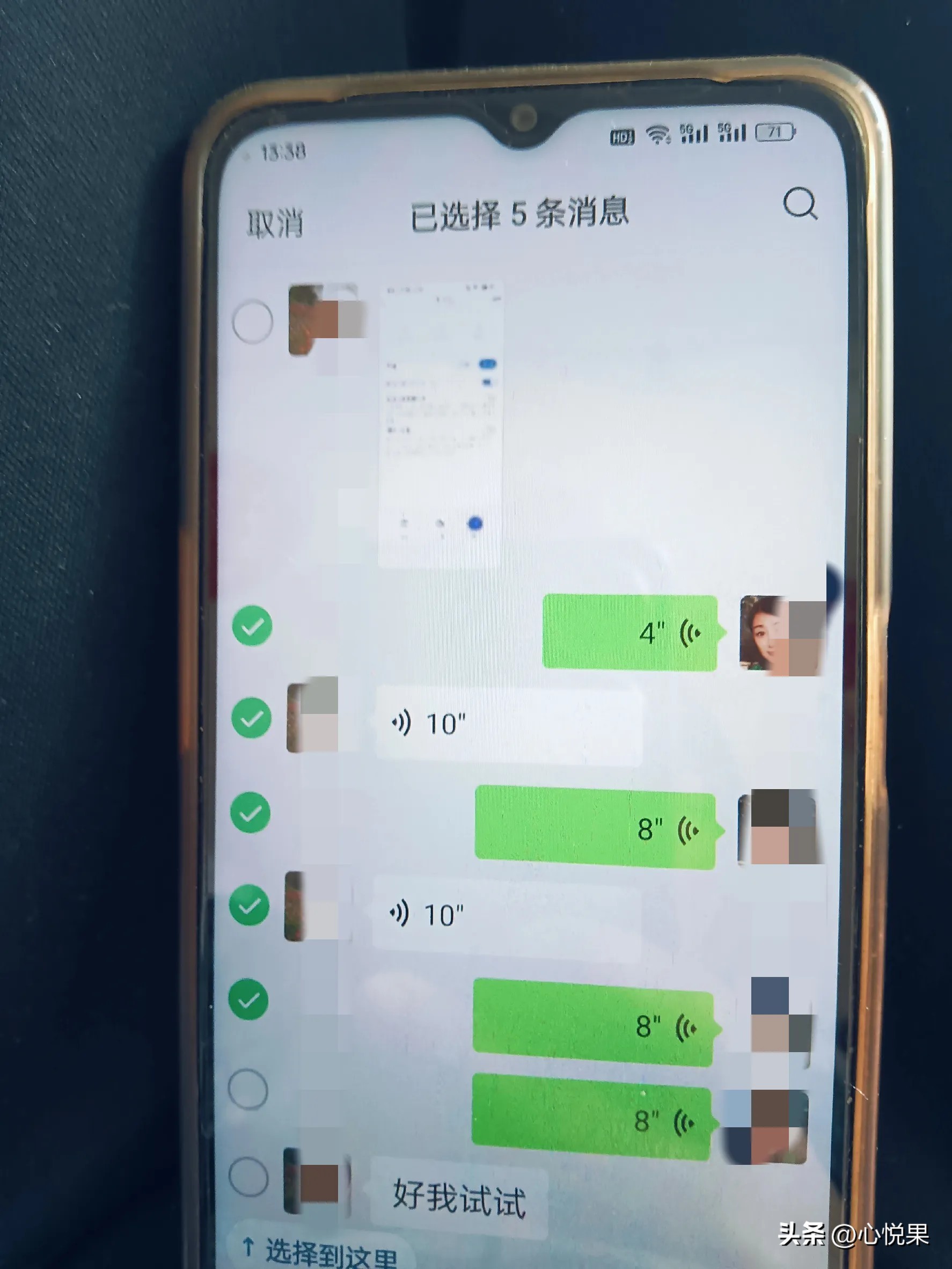 就是步骤都是差不多的,只是就是多加了一步,比如说我们把多段语音消息转发出去,可以长按其中的一条消息,点击多选,然后把这个都选上收藏就可以了,点击收藏以后呢,再点击上边有个三个点转为笔记,再直接转发就可以了