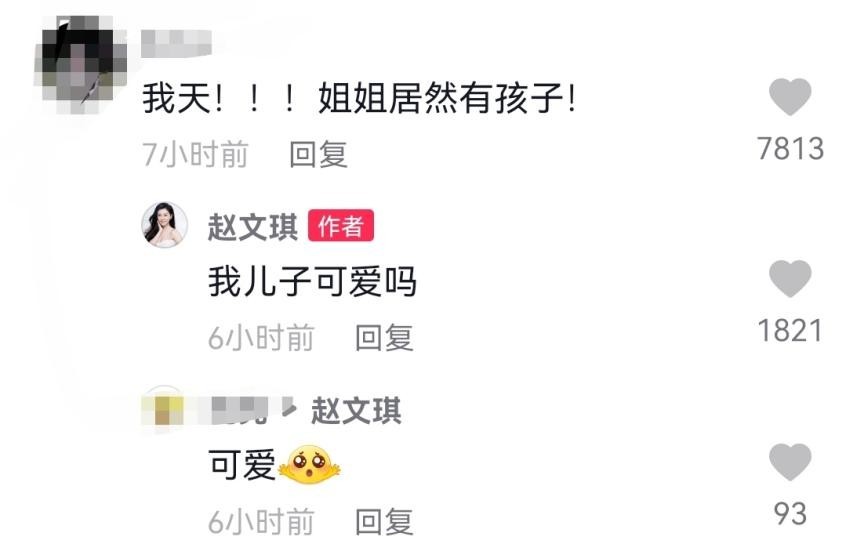 网友们都非常震惊,纷纷在评论区里留言表示没想到赵文琪都已经有孩子了,赵文琪还回复道:“我儿子可爱吗?”满满都是对孩子的自豪和喜爱。