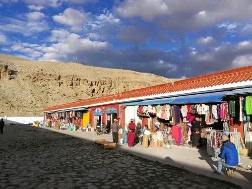 贸易市场坐落在孔雀河另一面,远望似一村落,近看是一些简朴的矮小石屋,每座石屋就是一个商店,店内布满尼泊尔或印度商人带来的各类商品。夏季还有许帐篷和地上摊贩,热闹非凡。买卖有时以物易物的方式进行。