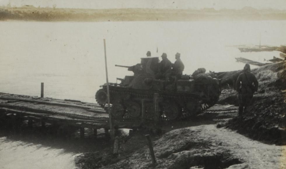 侵华日军装甲部队坦克过河。
