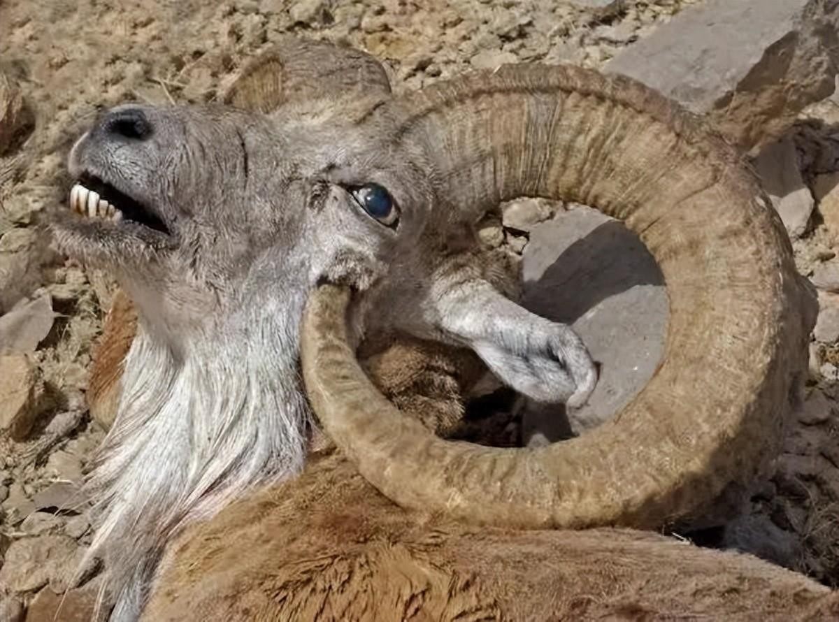 这只公羊的角犹如疯狂生长的藤蔓,盘旋扭曲,甚至穿透了头骨,简直让人惊叹不已!