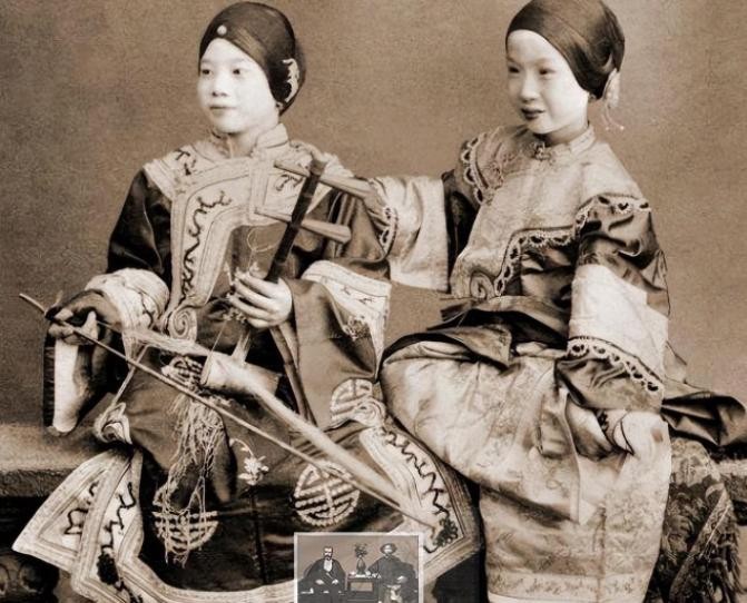 晚清名妓一名拉着二胡另一名面带笑容的不知道在看什么