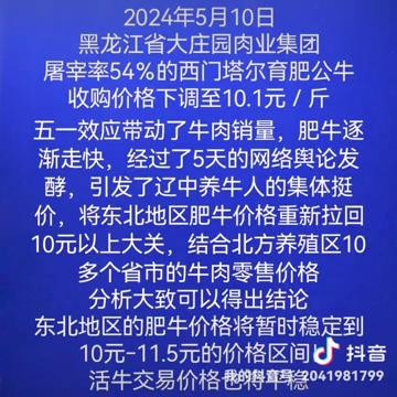 2024年5月10日,我的抖音号花省大庄园肉业集团屠宰率54%的西门塔尔育肥公牛收购价格下调至10.1元/斤。五一效应带动了牛肉销量,肥牛逐渐走快,经过了5天的网络舆论发酵,引发了辽中养牛人的集体挺价,将东北地区肥牛价格重新拉回10元以上大关。