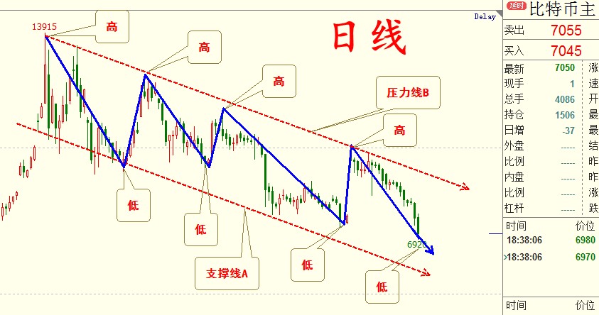 如上图,比特币价格从阶段高点13915到目前今日低点 6920,一直维持在支撑线A和阻力线B之间运行。前段时间,比特币有个跳空缺口,近日也被回补,今日创出价格新低。