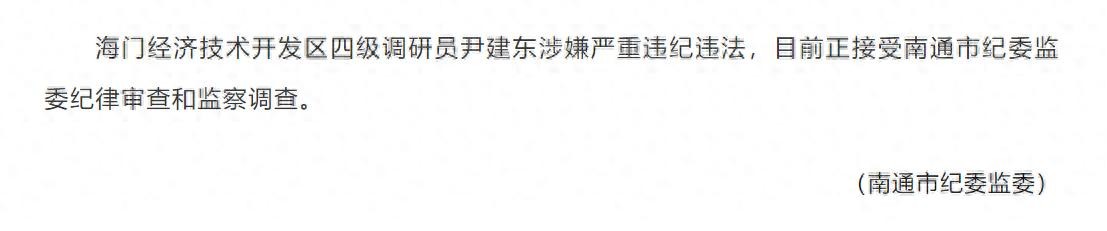 海门经济技术开发区四级调研员尹建东涉嫌严重违纪违法,目前正接受南通市纪委监委纪律审查和监察调查。