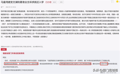 马銮湾西片区某发业主咨询未交房凭借合同入学,海沧区教育局答复说“按原招生政策规定,未交房小区不列入招生范畴。海沧区教育局将进一步调研,研究是否将未交房小区列入2022年招生范畴,请关注将于5月中下旬发布的海沧区2022年初中招生文件”。这次没有直接拒绝,而是答复研究调研,也就是今年的招生规则可能会有变动。