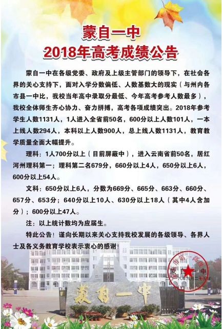 ◆今年,蒙自一中共有1131人参加高考,其中,1人进入全省前50名,600分以上人数101人,一本上线人数294人,本科以上人数900人,教育教学质量全面大幅提升。