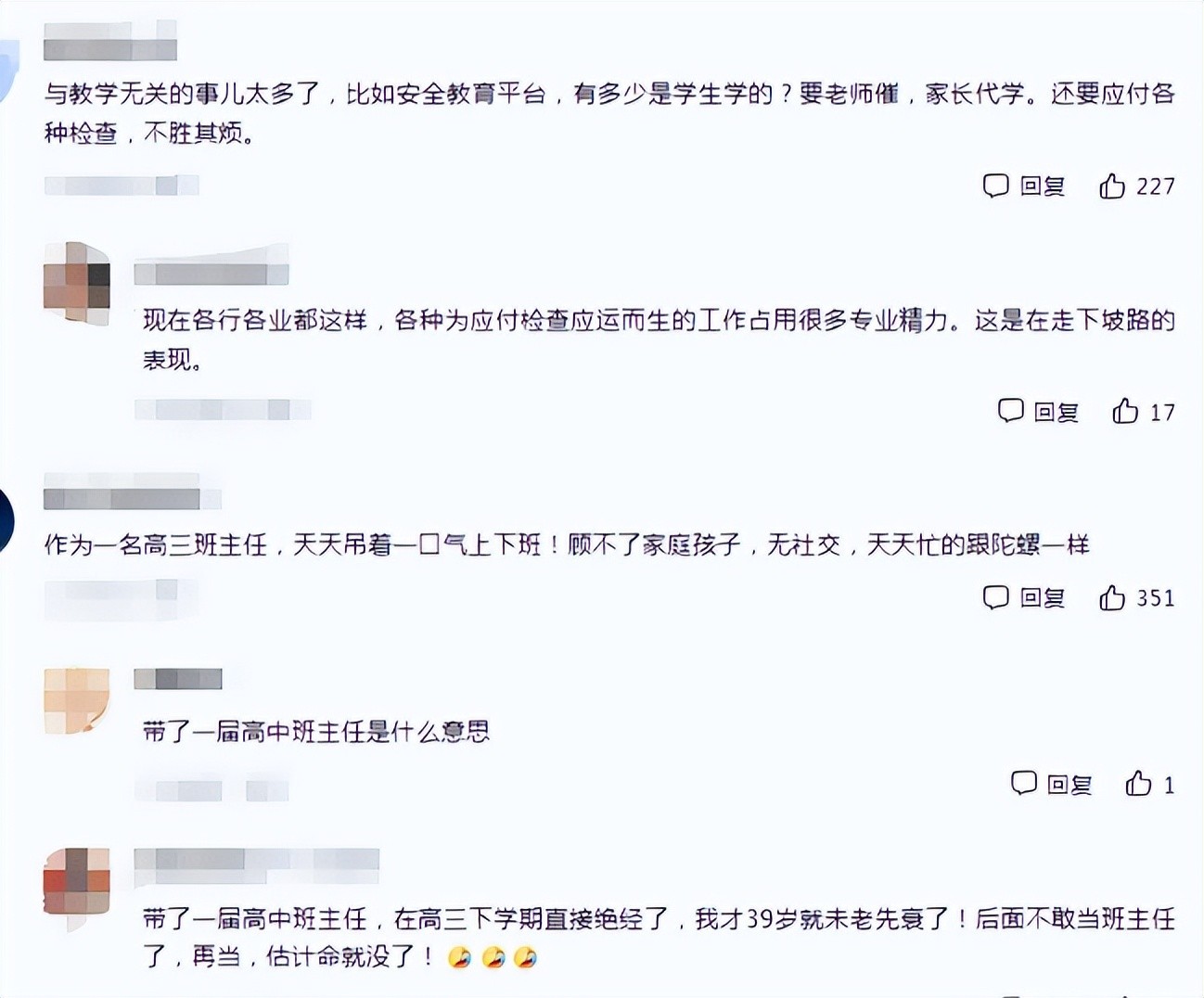 教师职业在表面上看起来充满了光鲜和荣誉,但背后却隐藏着巨大的工作压力。除了日常的教学任务,教师还要应对学校管理的各种要求和上级领导的检查。这些额外的任务让教师的工作变得异常繁重,而与教育无关的工作占用了他们宝贵的时间和精力。