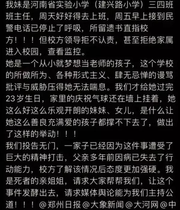 郑州小学23岁女教师的离世揭开了教育领域的一些深刻问题,引发了社会广泛的关注。她的遗书提出了一些重要的问题,包括教育体制的改革和教师的心理健康问题。这个事件让我们反思教育的未来,以期建立一个更加公平和健康的教育体制,使教师和学生都能够获益。