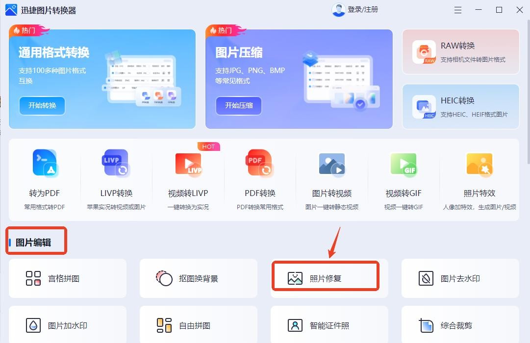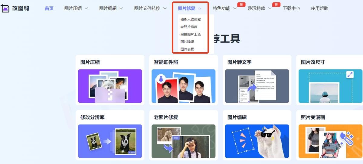 一站式图片编辑创意美化工具,划分为图片压缩、图片编辑、格式转换、趣玩特效等6大类别。其中的【照片修复】有分5种类型,添加图片就能自动处理。