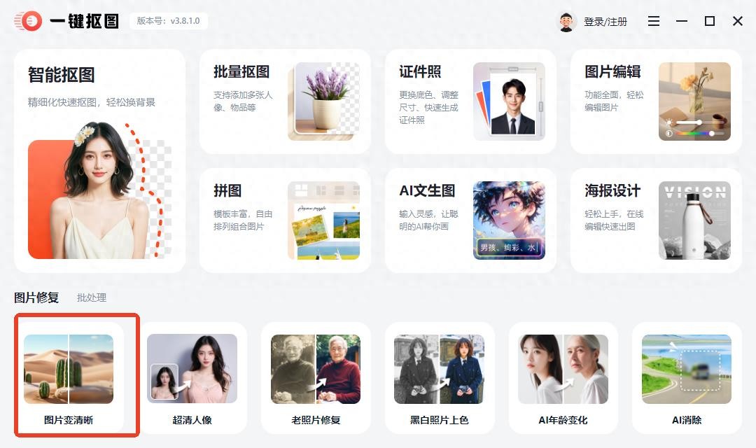 打开后点击进入【图像变清晰】的具体操作界面,可对PNG、JPG、BMP等格式图片进行一键AI变清晰,整个过程仅需几秒就能完成,保存就能得到高清图像了。