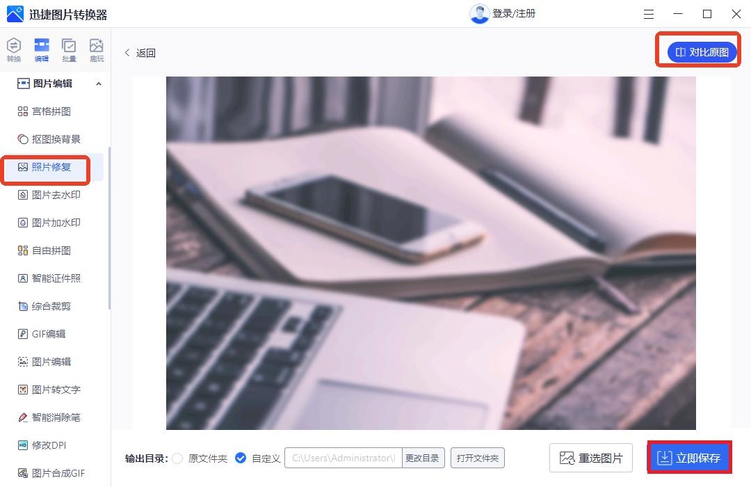 要用到的【照片修复】位于“图片编辑”模块,包括7种类型,选中后添加单图就能自动开启识别修复,还能随时对比原图,满意的话按下“立即保存”即可。