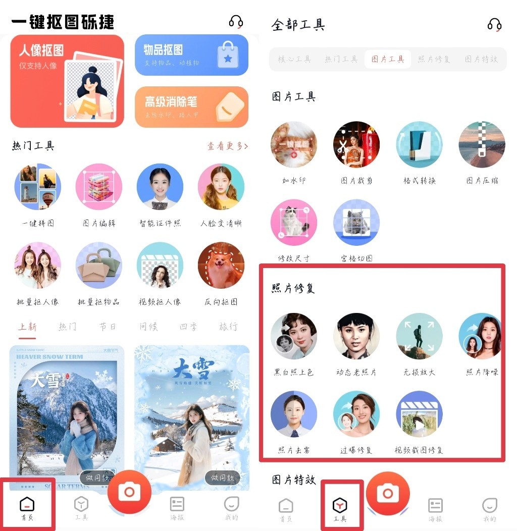 手机端也很推荐,会更加地方便快捷。在“工具”界面的“照片修复”下有预设7种,根据实际需要选择就好,帮助在改善画质的同时提升清晰度和色彩度。