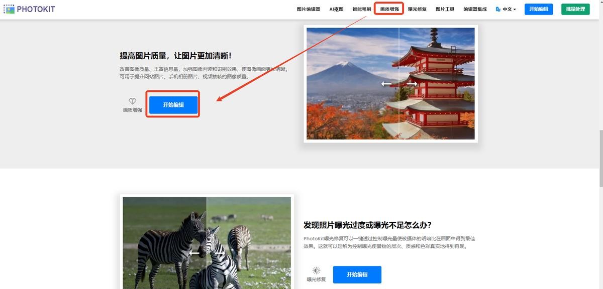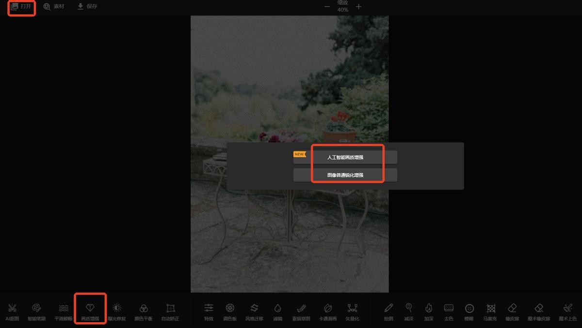 打开后先点击顶端的“画质增强”,接着按下“开始编辑”导入图片,再次选择“画质增强”,包括人工智能画质增强和图像普通锐化增强,修复完成就能保存。