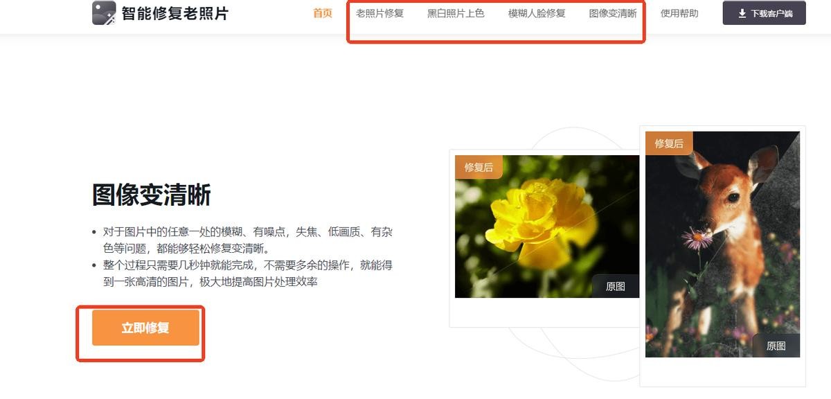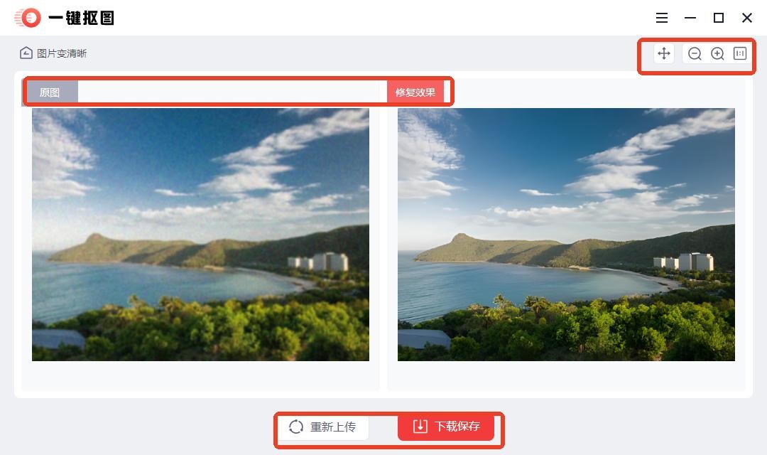 界面干净清爽,打开就能一眼看到所需的【图片变清晰】功能,上传图片后稍等片刻就会在界面同时显示原图和修复效果图,还支持放大、缩小等多种查看方式。
