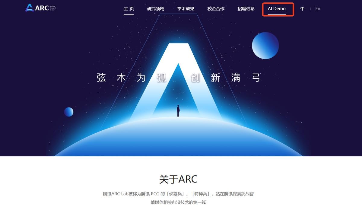 是腾讯公司对外展示其前沿技术研究成果和实验室动态的重要窗口,涉及的技术以视觉、音频和自然语言处理为主,其中的“AI Demo”也提供人像修复工具。