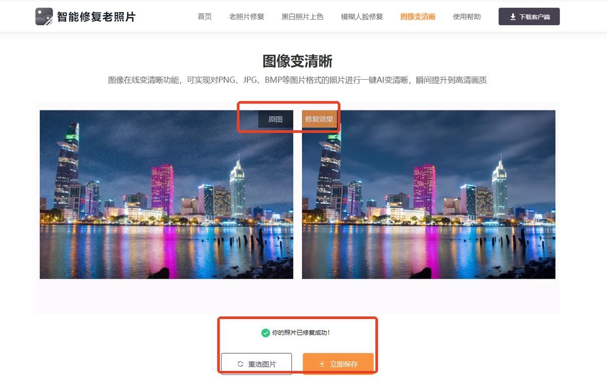 无论人像还是风景照片都可快速修复,完成后会同时展示原图和效果图,点击“立即保存”就能导出使用了,能较高程度地保留图像细节,提升图片品质。
