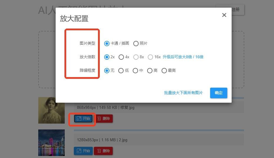 直接点击“选择图片”导入图片,接着按下“开始”,可对放大倍数、图片类型和降噪程度进行设置,静待完成就好了,完成后下载就能得到放大后的图片了。