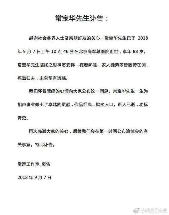 9月7日10点46分, 著名相声表演艺术家常宝华先生因病在北京去世,享年88岁。常宝华先生去世的消息传出后,冯远征、徐德亮、曹云金等发微博悼念老先生的离去:“常老先生一路走好!”中国曲艺家协会主席姜昆发文悼念,称“相声界又走了一位元老,欲哭无泪。他虽然年长,但一辈子如年轻人般的朝气蓬勃;他是老艺术家,但是一辈子以文艺战士的身份战斗在相声的舞台上。”