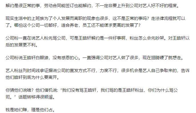 演员、艺人解约本来就是一件非常普通平常的事情,就像我们为了更好的发展,会在工作四年的公司离职一样,我还要养家糊口,为了家人,也会选择待遇更好的地方来工作,更何况艺人现在正处于上升期,上去了也就上去了,没上去就还得等下一个机会,所以人往高处走,艺人想要去追寻更好的资源也是能理解的事情了。