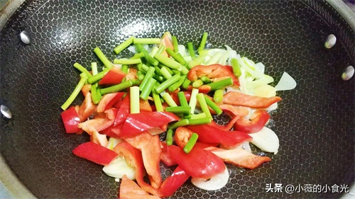 锅中油热,放葱花蒜片炒香,倒入蒜苔和大红椒大火翻炒20秒