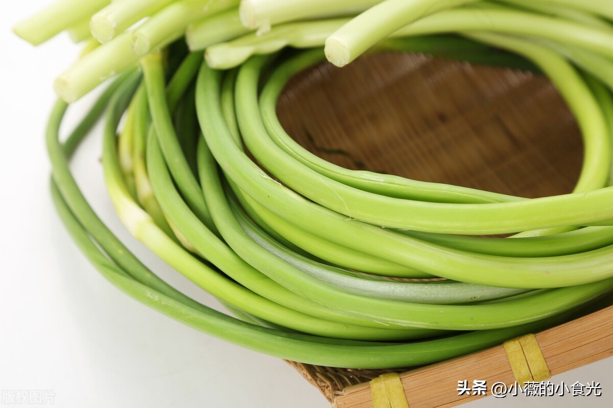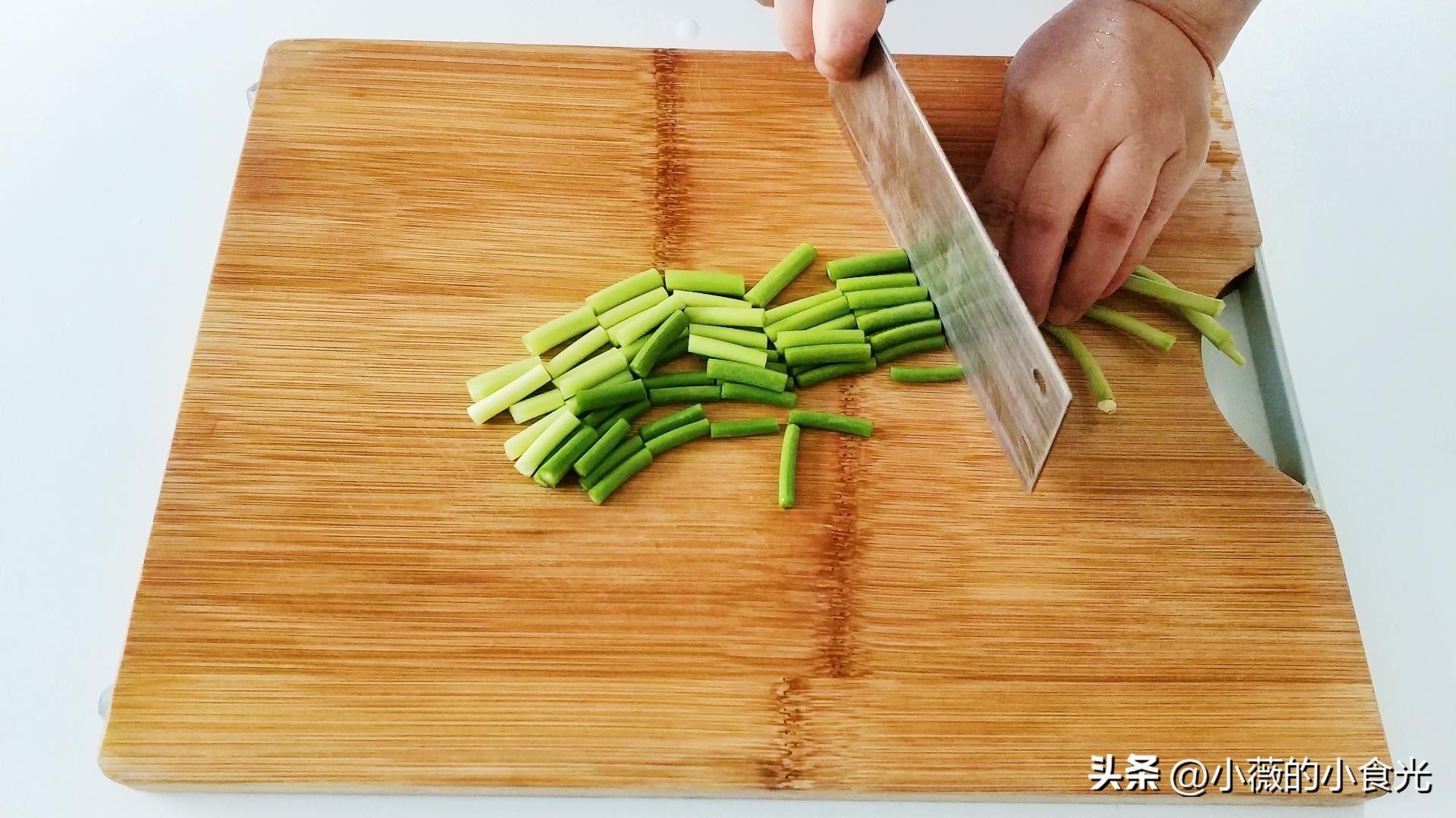 蒜苔择去头尾,洗净后切段。