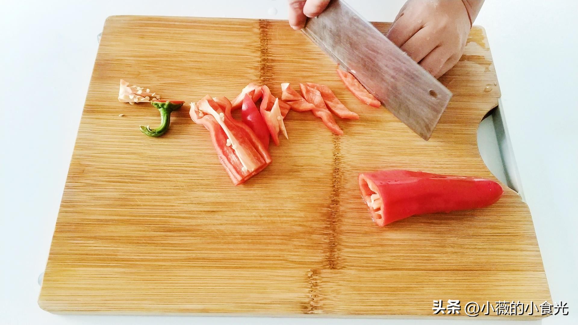 大红椒洗净去蒂去籽切菱形片。如果喜欢吃辣,可以放几个小米辣增加辣度。