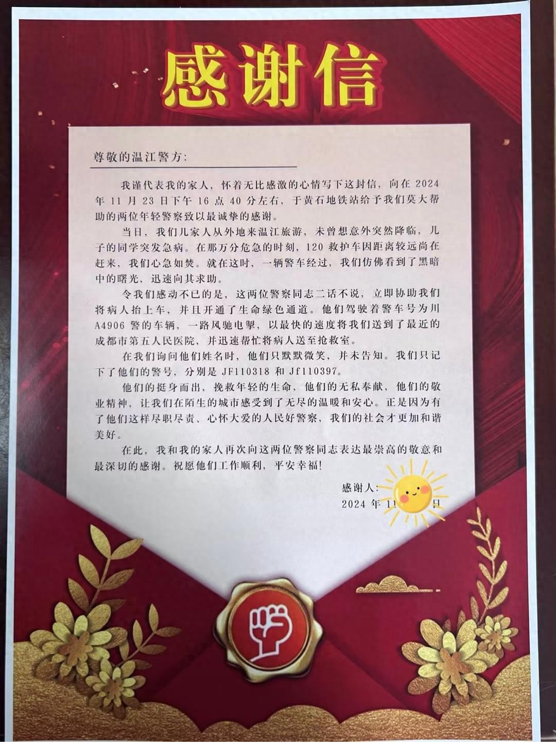“虽然你们不告诉我名字,但是我记住了你们的警号,今天专门来感谢你们。”11月25日下午2时许,雅安市民孟女士带着一面锦旗和一封感谢信来到成都市公安局温江区分局,在值班民警的帮助下,顺利找到了11月23日及时帮助送医施救的两名辅警,向他们表达感谢。