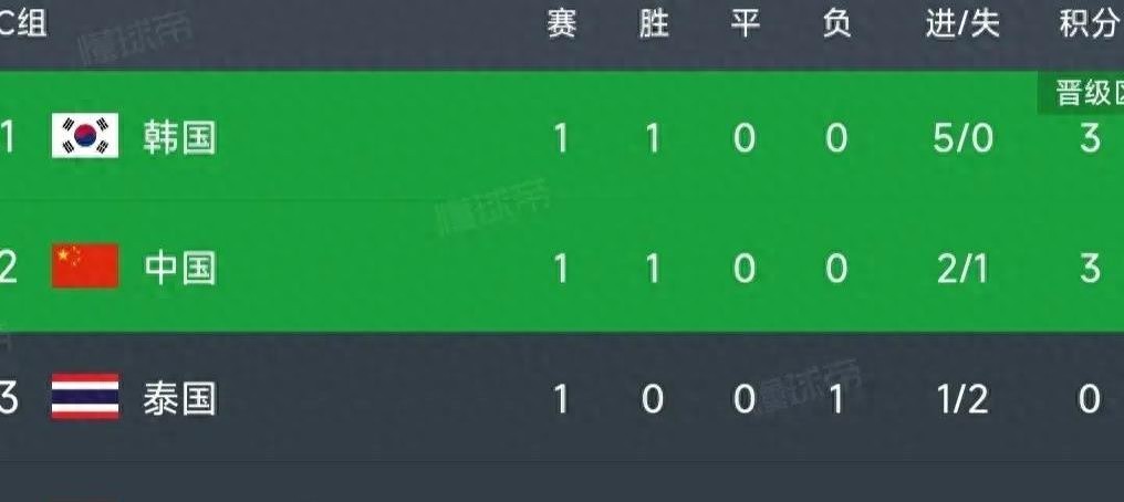 世界杯预选赛最新排名:中国以2比1战胜泰国,韩国以5比0获胜。