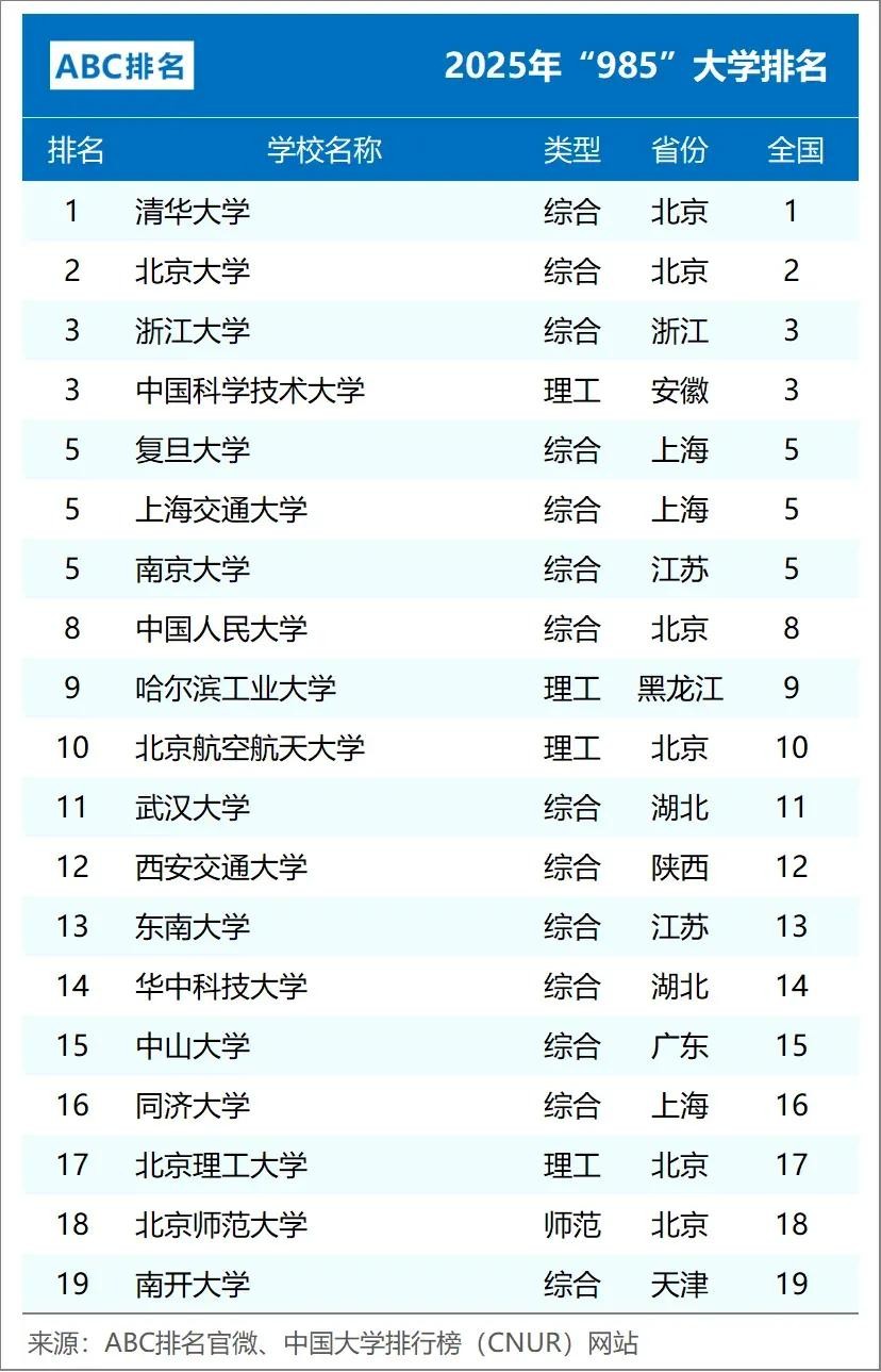 2025年ABC中国大学排行榜近日发布,39所"985工程"高校的竞争格局呈现出新变化。清华大学、北京大学继续稳居榜首,浙江大学与中国科学技术大学并列第三,形成"清北浙科"四强格局。
