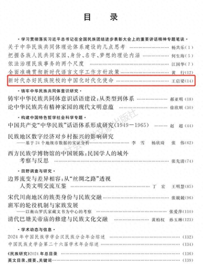 近日,云南民族大学王启梁教授撰写的论文《新时代办好民族院校的中国化时代化使命》在《民族研究》2024年第6期发表。《民族研究》创刊于1958年,是由中国社会科学院主管、中国社会科学院民族学与人类学研究所主办的有关民族研究的综合性学术理论刊物,是我国民族学研究的权威刊物。