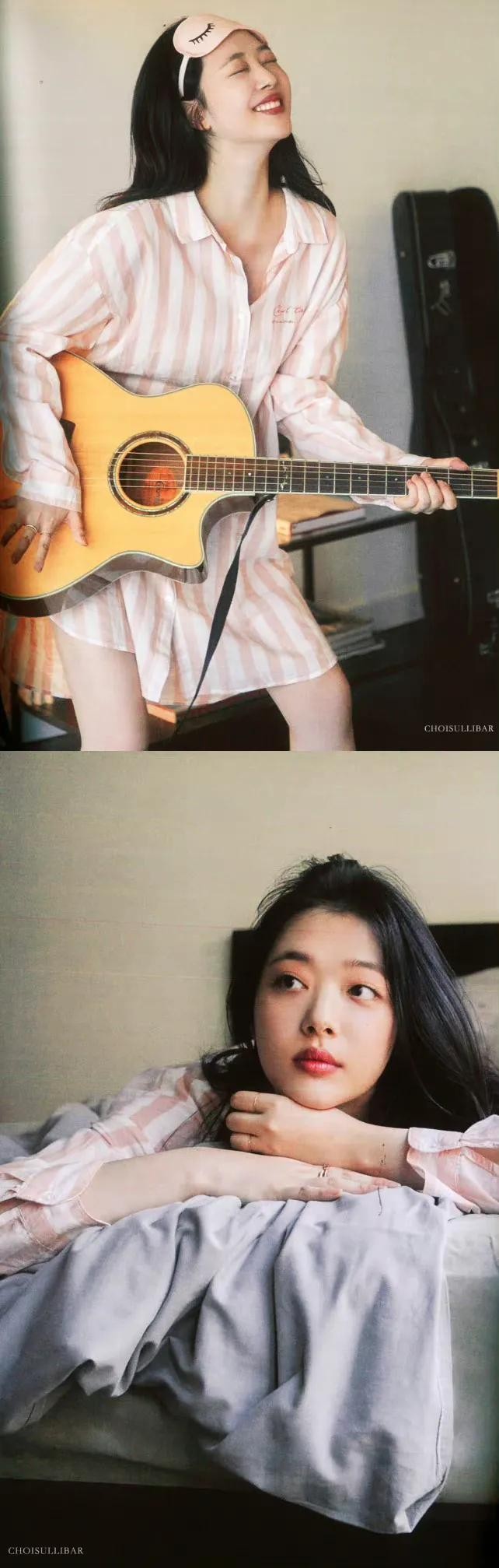 弹吉他的雪莉~装扮是很居家风格的装扮,粉色衬衫,粉色眼罩,自然可爱的打扮,抱着吉他演奏展示少女的俏皮。