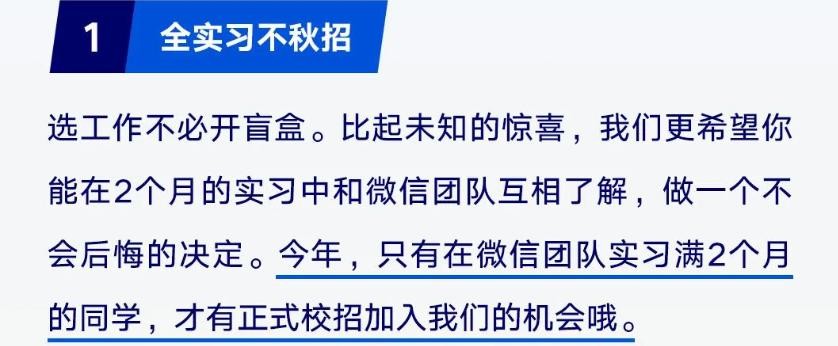 比如腾讯微信团队表示,今年的招聘中:全实习不秋招,只有在微信团队实习满2个月才有正式校招的机会。