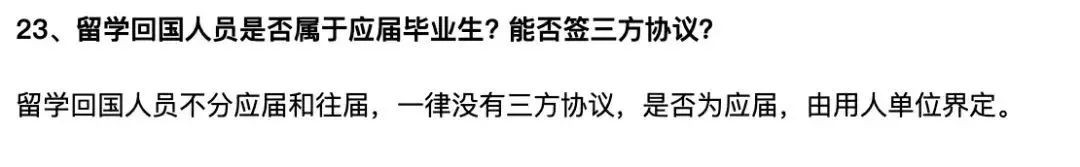 而对于海外留学生,教育部留学中心有明确规定:留学回国人员不分应届往届,一律没有三方协议,是否为应届生,由用人单位界定。