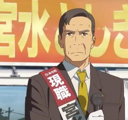 然后是三叶、四叶的父亲宫水俊树,原名应该是沟口俊树,与妻子宫水二叶结婚后选择入赘宫水家,将原姓氏沟口改为宫水。但后来妻子宫水二叶在生下小女儿宫水四叶几年后,重病去世,伤心欲绝的宫水俊树放弃了神职离开了宫水神社,一心投向政界。是一个较为严肃的人,但在被泷操纵的三叶揪住领带后了解宫水家族和三叶的他也发现了三叶不是原来的三叶,根据结果来看,他最后应该同意了三叶的建议将居民转移到了安全地区。