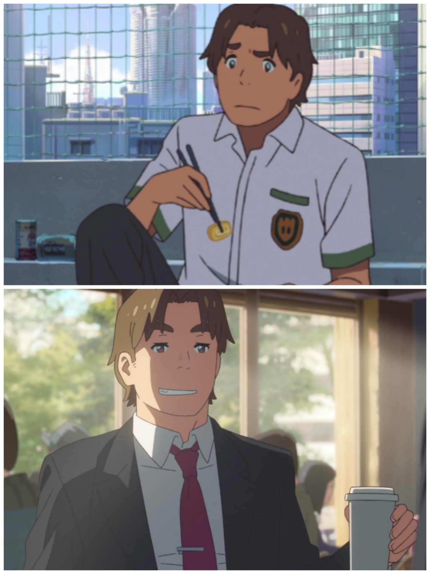 首先是高木真太,是泷的同学加好友,身材高大憨厚而且性格直爽、乐于助人,平常下课喜欢与泷和司去咖啡厅。在泷去寻找三叶时替男主去餐厅打工。