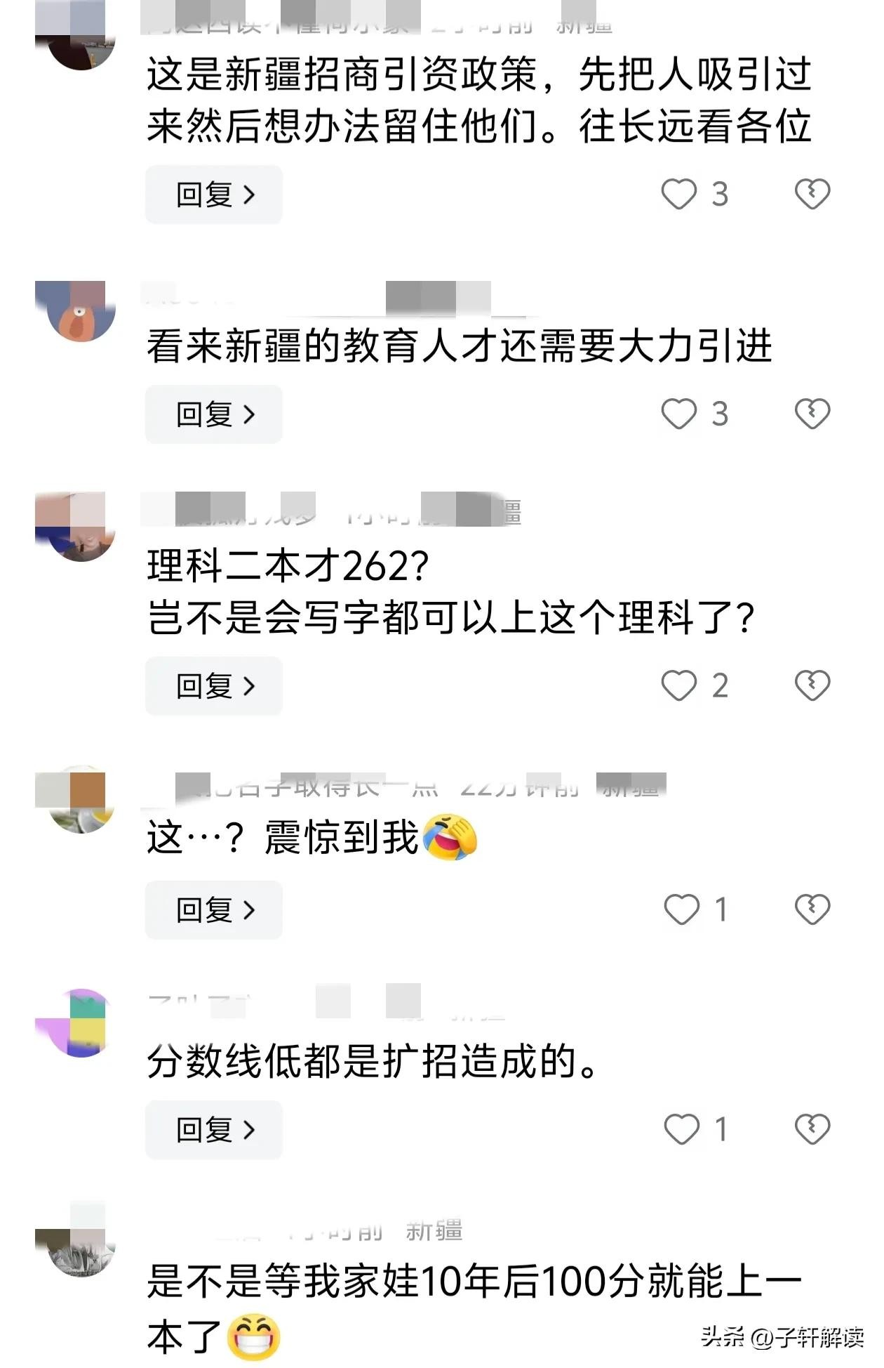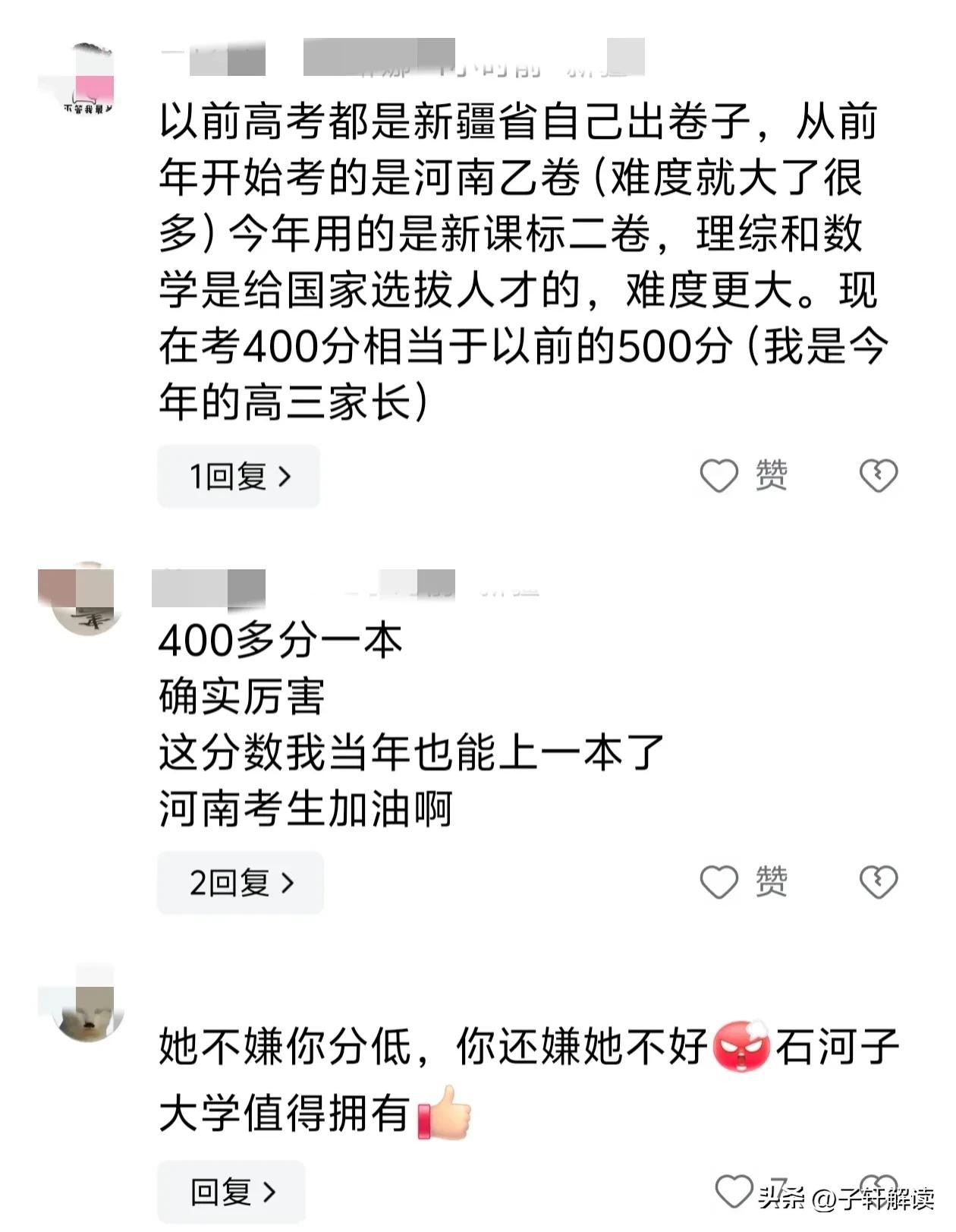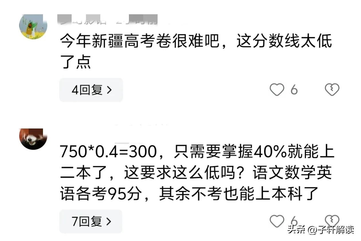 也有网友认为以前高考都是新疆省自己出卷子,从前年开始考的是河南乙卷,今年用的是新课标二卷,理综和数学是给国家选拔人才的,难度更大。现在考400分相当于以前的500分。